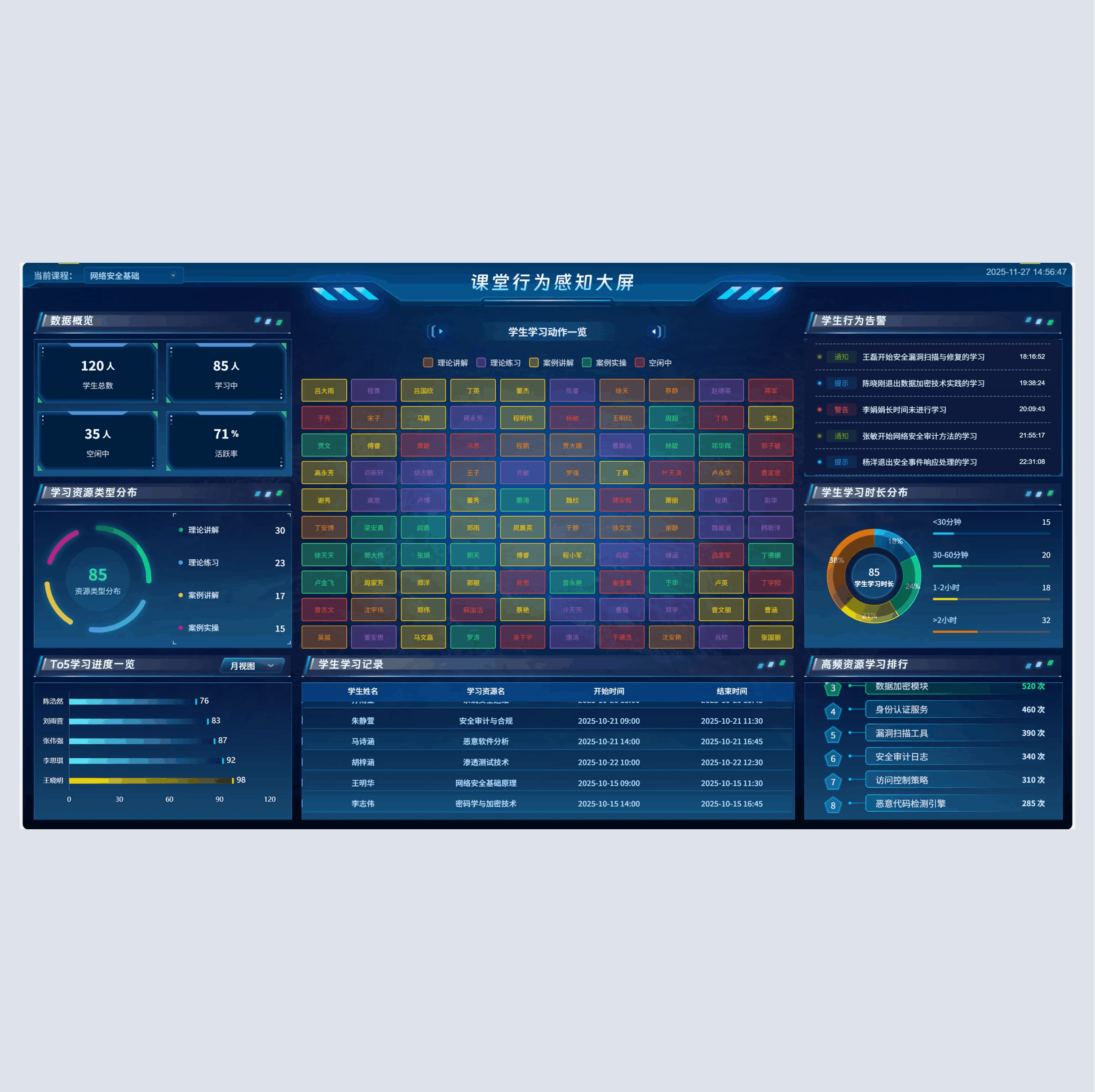 教学驾驶舱是NO钱包官网问课平台的智能指挥中心,整合教学全流程数据,顺利获得可视化仪表盘的形式,为教师与教学管理者给予全面、实时的教学情况反馈。驾驶舱涵盖多维度数据指标,包括实时学习总人次、今日学习人次、学生总数、班级总数、各类型资源学习占比、热门课程学习排名、难点任务统计、学生活跃度趋势、各时段学习人次分布等。