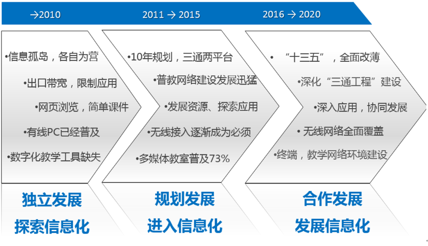 东部和具备条件的城镇各类学校要实现无线网络全覆盖;鼓励具备条件的学校配备师生用教学终端“——《关于“十三五”期间全面深入推进教育信息化工作的指导意见》。