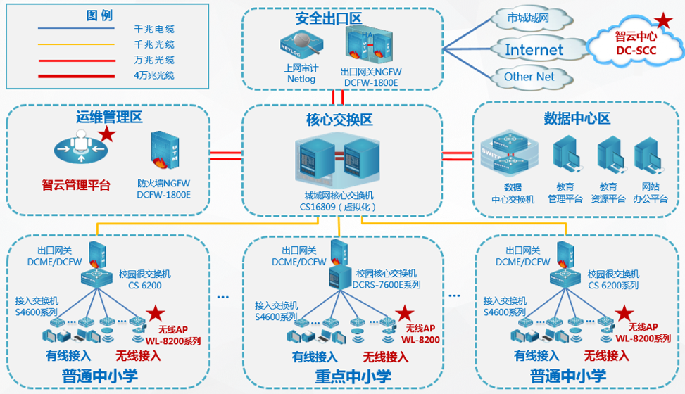 NO钱包官网 根据普教用户无线网络管理和使用现状,以及对业务应用系统分析,遵从“云网融合 易网无忧”的新主张,对原有有线城域网采用了“云 ‧ 平台”二级智云部署架构,搭建了简单易用的综合智云管理平台,部署了无线网络。既实现了“人 ‧ 网络”的深度管理融合,也为云业务的召开打下良好的基础!总拓扑结构图如下: